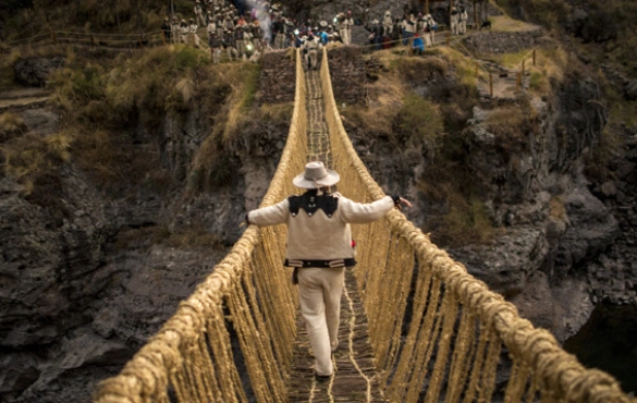 Desde el tiempo de los Incas existió una gran red de caminos llamado Qhapaq Ñan, estos unían los territorios de la gran Cultura Inca para atravesar la accidentada geografía de los andes, se construyeron Puentes Colgantes hechos de fibras vegetales, esta compleja tecnología se ha transmitido de generación en generación y existe un único puente que se ha mantenido ya que se renueva anualmente hasta el día de hoy por más de 500 años haciéndonos experimentar que el tiempo aún no ha pasado.Este maravilloso lugar está ubicado sobre el Río Apurímac a 3700 metros sobre el nivel del mar, donde cada año más de 1000 personas de cuatro comunidades se reúnen para renovar sus estructuras, este ritual ancestral fue reconocido en el año 2013 por la UNESCO como Patrimonio Cultural Inmaterial de la Humanidad.Cruzar el Puente Q’eswachaka es como Retroceder en el Tiempo. Esta hermosa expresión cultural está esperando por ti.